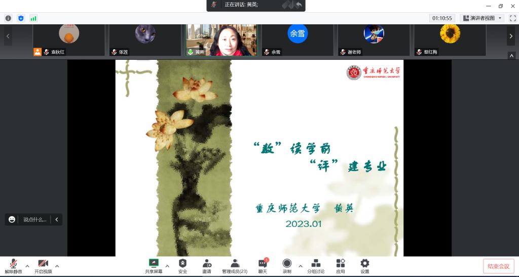 接着,副系主任余雪老师进行年度工作述职。最后,由学前教育系主任黄英老师工作述职,并做“‘数’读学前,‘评’建专业”的主题报告。黄老师从教学与教改、学科、研究生教育、学生提升、社会服务等方面,以详实的事实和数据汇报学前教育系在2022年度取得的成果。同时,在深入剖析《重庆市普通高等学校本科专业监测评价指标体系》中5个一级指标、15个二级指标,42个评价点的基础上,分析学前教育专业建设的成绩与不足,提出了凸显学生中心,支持学生发展;整合资源,提升团队,增加核心竞争力;突出高级别项目与成果培育等专业发展思路。期待全体教师团结进取,守正创新,勇于突破,展现“新面貌”,奋力“新征程”,迎接我校学前教育专业110周年的生日。