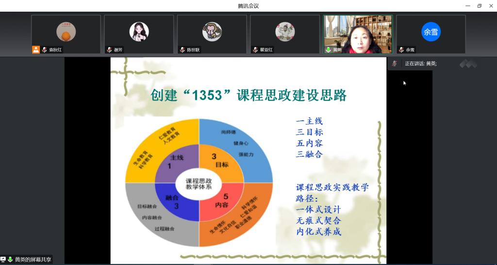 首先,由学前教育系主任、教育部课程思政教学名师黄英老师作“课程思政的思与行”主题报告。黄老师总结了我校学前教育专业课程思政在项目立项、课程建设、案例获奖、教研室建设方面的发展和形成的链条式成果。然后从“为何?”“何为?”两个角度分享学前教育专业课程思政的背景、内涵和做法。希望专业课程门门有思政、专业教师人人讲育人,教师成为先进思想文化的传播者、学生健康成长的指导者,实现专业引导和价值引领的有机融合。刘小红、蔡红梅、谢梦雪等老师纷纷发言分享自己的感悟、做法与经验,并就所任课程思政问题进行交流。