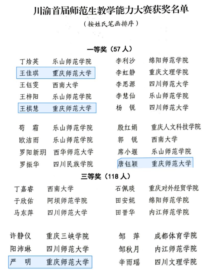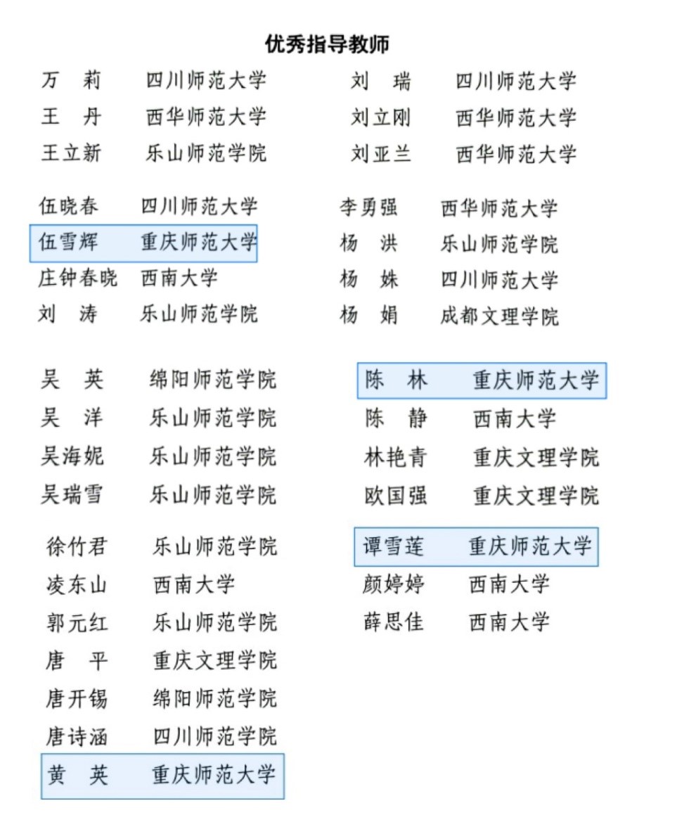 近日,川渝首届师范生教学能力大赛结果公布,我院参赛的四位选手取得优秀成绩,获得一等奖3个,三等奖1个:学前专业王佳琪获学前组一等奖、教育学专业唐钰颖获小学语文组一等奖、教育技术学专业王棋慧获信息技术组一等奖,教育技术学专业严明获通用技术组获三等奖。黄英、谭雪莲、伍雪辉、陈林四位老师获优秀指导老师荣誉称号。