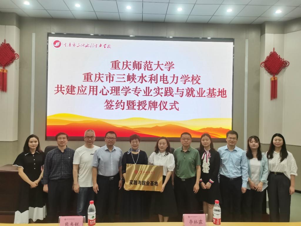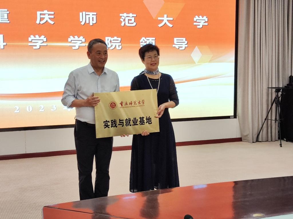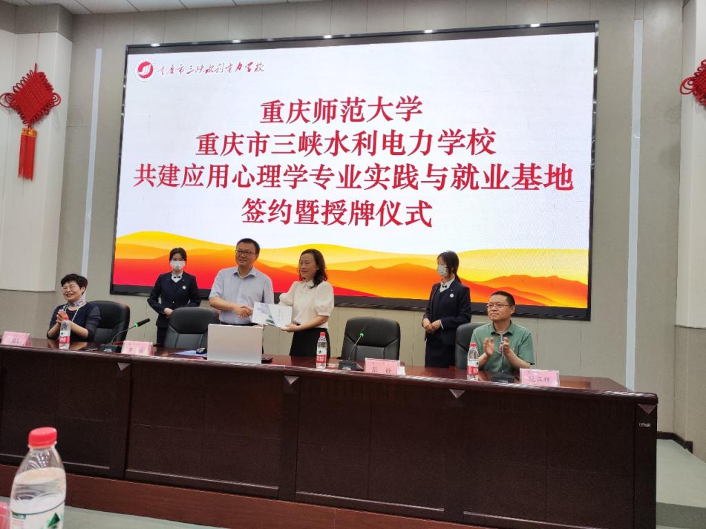 随后,实践与就业基地签约暨授牌仪式在该校第一阶梯教室举行。重庆市水利电力学校校长张静在仪式上回顾了自2009年实习基地建立以来与我院应用心理学专业的合作历程、所取得的成绩;介绍了该校心理健康教育工作的特色、所获得的荣誉;对我院实习生的实习表现给予了充分认可。罗庆书记向重庆市水利电力学校14年的合作支持表示感谢;介绍了我院的发展脉络、学科专业设置、师资力量、学生规模、取得的教学、科研、人才培养成绩等;祝愿学校培养更多更高水平的品德过硬、专业素养扎实的技术人才。两位领导热情洋溢的致辞后,罗庆书记与张静校长签订了实践与就业基地协议,并进行授牌。此次签约授牌仪式,是对2009年建立的心理健康教育实践教学基地的战略升级,将进一步拓宽我院应用心理学专业与重庆市水利电力学校的合作领域,深化合作力度,有助于未来双方创新人才培养模式、提升人才培养质量。