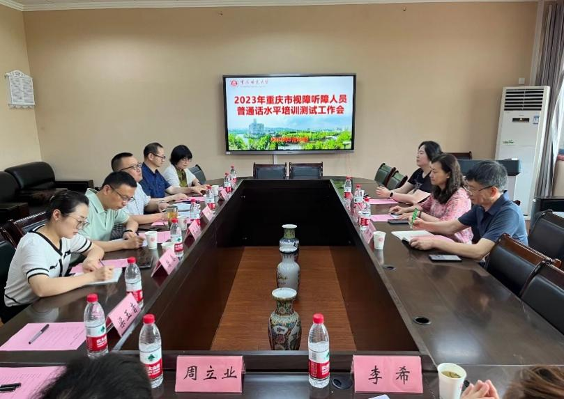 为了保障普通话测试工作顺利进行,29日上午听障人员测试当日,市教委语委办主任蔡理、市残联教育就业部三级调研员陈慧敏一行,来我校调研了2023年重庆市视障听障人员普通话水平测试相关工作情况,并与我校师生代表进行了交流座谈,参观了普通话测试考场及我校特殊儿童心理诊断与教育技术重庆市高校重点实验室。PA视讯教务处副处长毋志民处长、PA视讯党委书记罗庆等相关领导陪同调研。