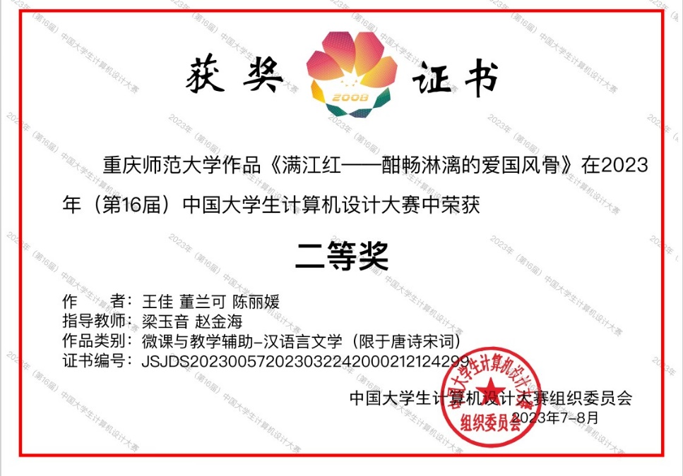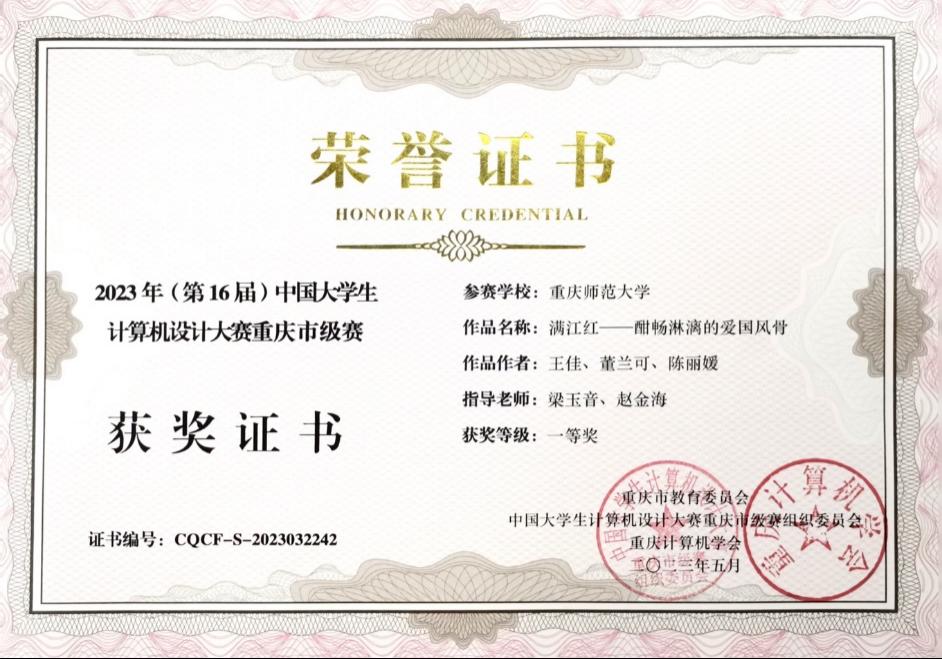 近日,2023年(第16届)中国大学生计算机设计大赛(微课与教学辅助/数媒静态设计)沈阳决赛区拉开帷幕,我院代表队作品《满江红——酣畅淋漓的爱国风骨》荣获重庆市级赛一等奖,国家级赛二等奖。该作品由PA视讯梁玉音、赵金海两位老师指导,由特殊教育(信息与资源)专业2021级王佳、董兰可、陈丽媛三位同学共同完成。