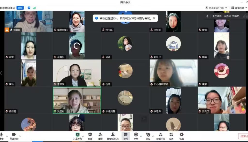 反诈志愿服务活动开展以来,核心团队人员每周都及时总结每周的援助情况及存在的问题,积极与警方和指导老师沟通,帮助志愿者处理心理援助中的困扰。为促进心理援助工作更好地推进与落实,2023年10月29日晚,反诈心理援助志愿者服务队进行第一次线上总结会议。会上,服务队队长刘静茹,总结汇报了近一个月来的总体服务情况及存在的困扰,王军警官与洪显利副教授耐心解答成员们在过程中遇到的主要问题,帮助成员进一步明确心理援助的对象、目标及意义,厘清心理援助活动中的注意事项及改进措施,拓展共情与理解来访者的方法,建构积极主动与值班民警沟通制度、值班工作中及时反馈与交接流程,加强志愿者们与陈家桥派出所的紧密合作,实现信息资源整合。此次总结,为后继工作的顺利开展打下了坚实的基础。