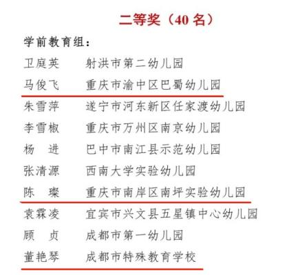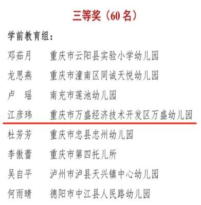 此次大赛中,毕业于我校学前专业的张伊黎(2009级本科)荣获一等奖;马俊飞(2010级本科)、陈璨(2018级研究生)、董艳琴(2019级研究生)荣获二等奖;江彦玮(2015级本科)荣获三等奖。此次大赛体现出我院学前教育专业卓越的人才培养质量,是重师校友在教育沃土上践行“厚德,笃学,砺志,创新”的充分展现。