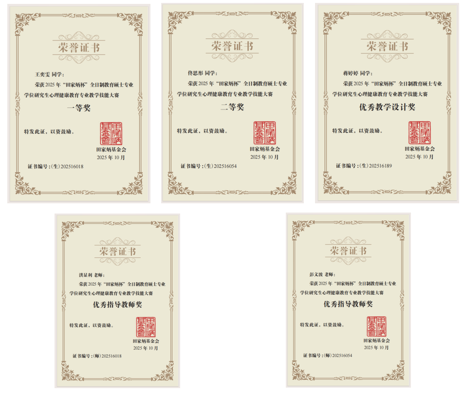 近日,2025年全国“田家炳杯”全日制教育硕士专业学位研究生心理健康教育专业教学技能大赛决赛在东北师范大学圆满落幕。作为国内层次最高、规模最大的教育硕士学科技能竞赛之一,本次大赛由田家炳基金会冠名,中南民族大学与东北师范大学联合主办,吸引了全国90余所高校的近400名研究生及指导教师参与。我院心理健康教育专业硕士学位研究生王奕雯、佟思彤、蒋婷婷在大赛中表现优异,最终斩获一等奖1项、二等奖1项及优秀教学设计奖1项的佳绩。