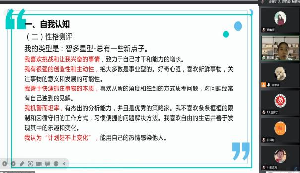 参赛选手分别从自我认知、职业认知、职业决策、计划与路径、自我监控等方面精彩地展示了各自团队的职业规划方案,参赛团队方案设计特点鲜明、风采各异、逻辑清晰,紧跟时代节奏,把握发展脉搏,充分展示了我院学子在新形势下对就业观念的新认识。