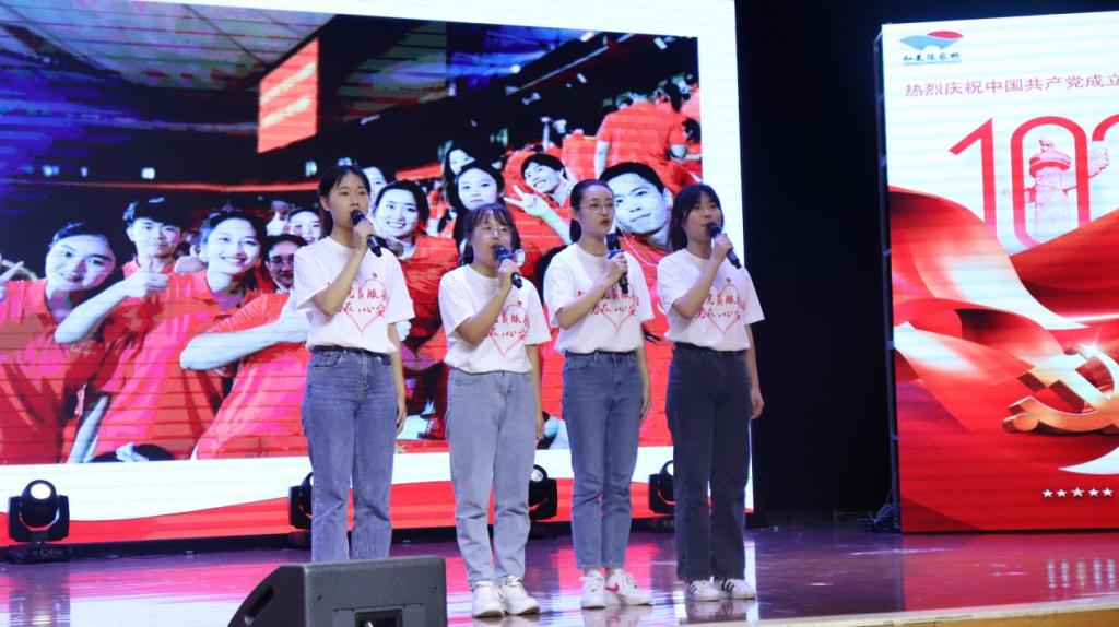 致敬百年路,砥砺新征程。2023年6月30日,在PA视讯PA视讯教工一支部党员谭雪莲同志的带领下,研究生支部党员梁莹同志,本科生支部积极分子钟馥蔚同志、刘倩同志和郑婷婷同志,应邀代表PA视讯PA视讯参加了陈家桥街道举办的庆祝中国共产党成立102周年活动,朗诵诗歌《青春万岁》。
