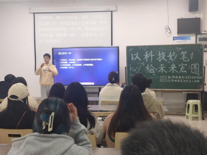 首先,由2022级特殊教育(信息与资源)本科团支部同学进行“中国科技发展历史及杰出人物”的分享,并通过视频、图片、人物事迹等方式回顾了新时代中国科技强国的发展历史。在璀璨的历史长河中,我们走进“钱学森”“冯如”“钱天白”等科技先辈的科研生活,学习他们在中国科技发展事业中做出的伟大贡献。研究生三支部负责人翁瑾同志对手语技术的发展及手语无障碍交流进行了介绍与分享,带领同学们观看了现代信息技术应用在手语无障碍设施上的相关视频,加深了同学们对于无障碍沟通环境建设的理解。