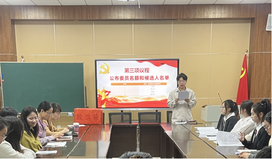 随后,吴小东同志公布委员名额和候选人名单:委员应选名额为3名,差额1名,候选人为杨逐、曾乐平、吴小东、刘婧四位同志。宣布胡爱苓同志担任监票人,蒲文静同志担任计票人。大会采取无记名投票、差额选举的方式,选举产生了由吴小东、杨逐、曾乐平三位同志组成的新一届支部委员。随后,新一届支部委员会召开第一次全体会议,通过投票的方式等额选举产生了党支部委员会书记,同时,协商确定了各委员工作分工。